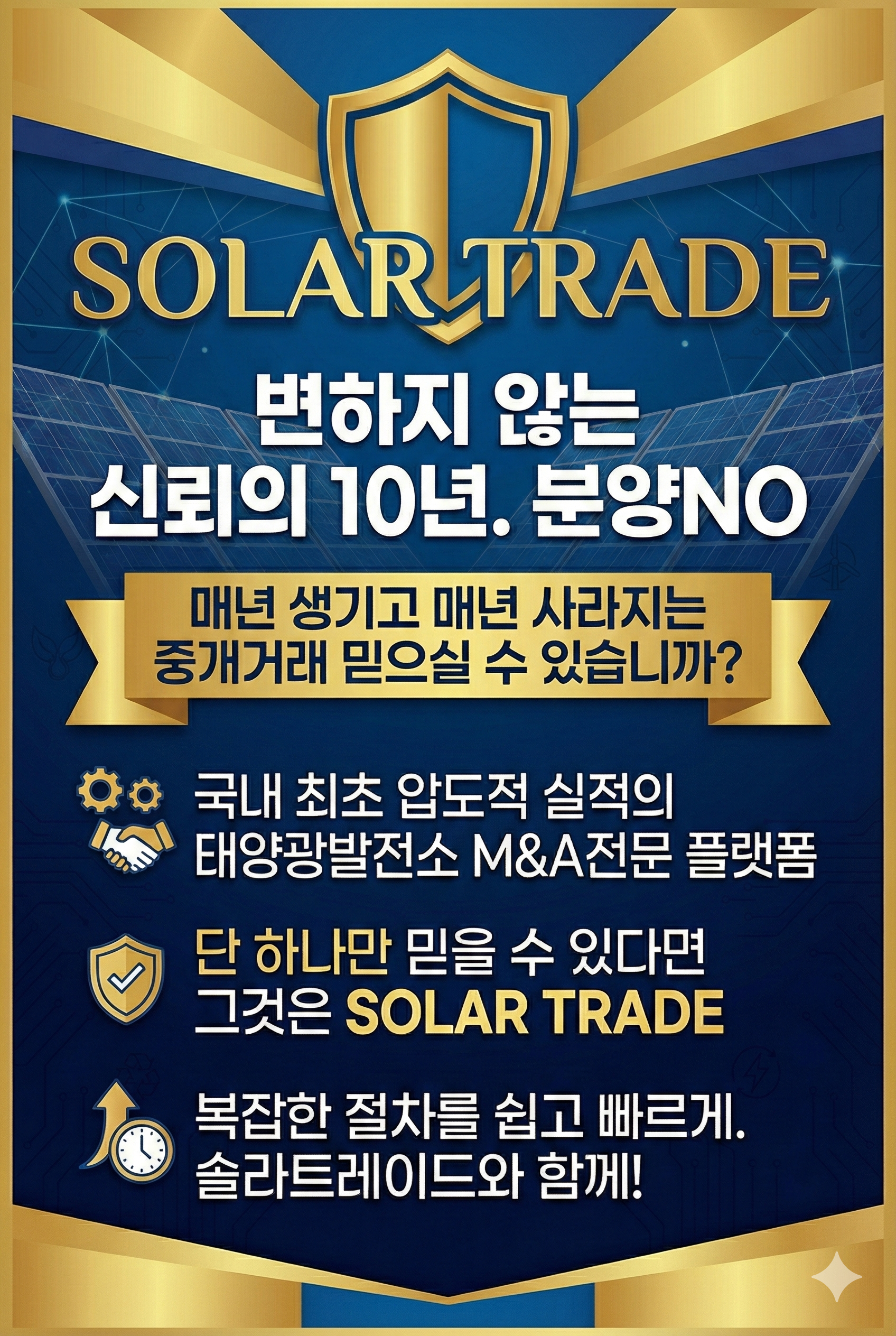 태양광발전소 매매 및 양도양수의 완벽한 기준, 20년 현장 실무 솔라트레이드2026년 현재 대한민국 태양광발전사업은 그 어느 때보다 치열한 전환기를 거치고 있습니다. 탄소중립 실현이라는 시대적 과제 속에서 신재생에너지의 핵심인 태양광발전소의 자산 가치는 연일 상승하고 있지만, 실제 발전 사업주들이 현장에서 직면하는 난관은 결코 만만치 않습니다. 한전 계통 연계 지연과 선접속 후제어 정책으로 인한 수익성 불안, 그리고 각 지자체의 엄격한 발전시설 이격거리 규제는 신규 사업 개발을 주저하게 만드는 거대한 장벽입니다.이러한 시장 환경 속에서 리스크를 최소화하고 가장 빠르고 확실하게 수익을 창출할 수 있는 대안으로 태양광 M&A 시장이 급부상하고 있습니다. 이미 복잡한 인허가를 모두 통과하고 전력수급계약을 맺어..